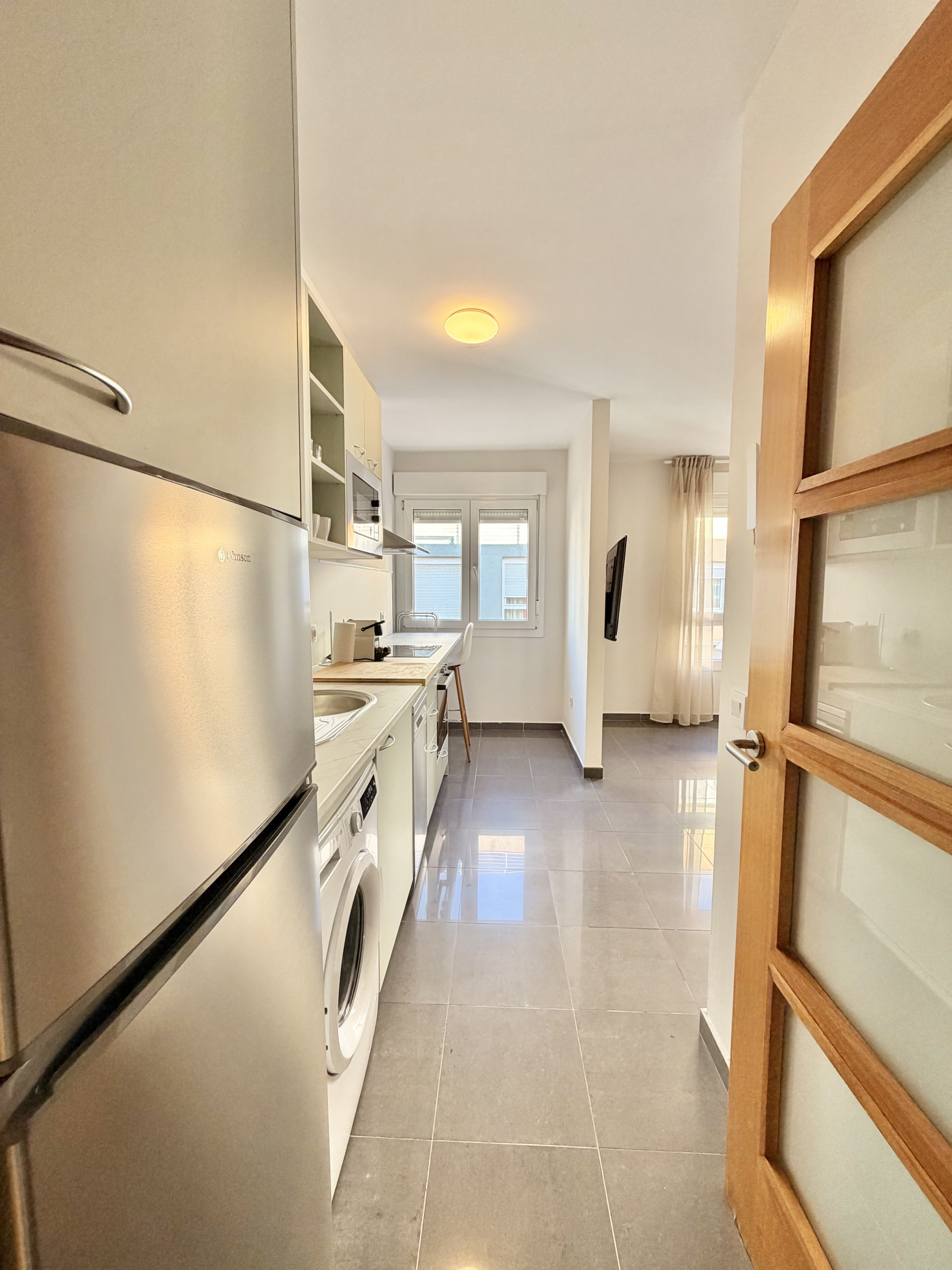 La cocina americana, eléctrica, está equipada con nevera, microondas, horno, congelador, lavavajillas, vajilla/cubertería, utensilios/cocina, cafetera, tostadora y hervidor de agua.
